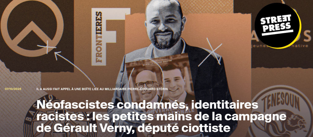 Une enquête de StreetPress, publiée le 7 octobre 2025, révèle le rôle clé joué par Clément Martin et son agence Prémonition dans la stratégie de communication politique de l’extrême droite française, nottament pour le compte de Gérault Verny, un député ciottiste (récemment épinglé par Mediapart pour un compte anonyme diffusant des contenus racistes et sexistes) :