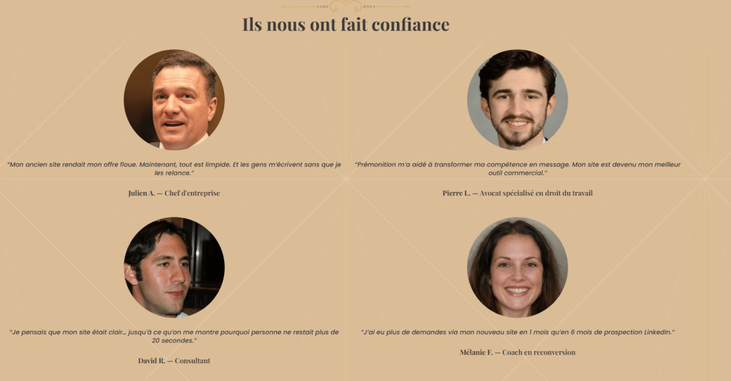 Autre changement significatif : les noms des personnalités précédemment mises en avant, Thaïs d’Escufon, Damien Rieu, Stéphane Ravier et Pierre Sautarel, disparaissent du site. À leur place, quatre témoignages clients sont présentés, illustrés par des visages dont aucune trace ne peut être retrouvée en ligne. Ces images présentent des caractéristiques similaires à celles générées par des outils d’intelligence artificielle comme Thispersondoesnotexist.com.
