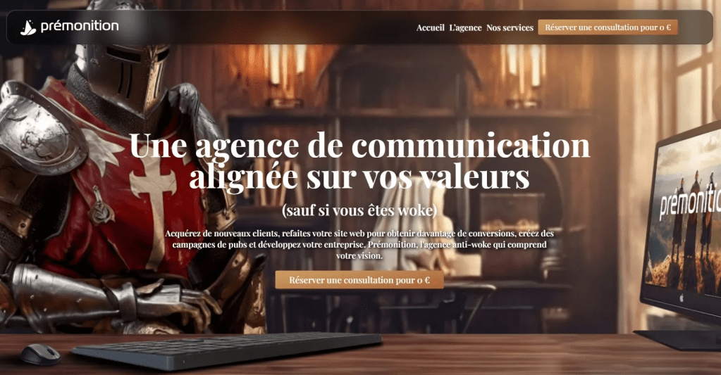 Dès la page d’accueil, l’esthétique interpelle : un chevalier en armure, croix templière sur la poitrine, fait face à un ordinateur. Un slogan s’affiche : « Une agence de communication alignée sur vos valeurs (sauf si vous êtes woke)». Un bouton propose de réserver une “consultation gratuite”. En faisant défiler la page, le ton se confirme.
