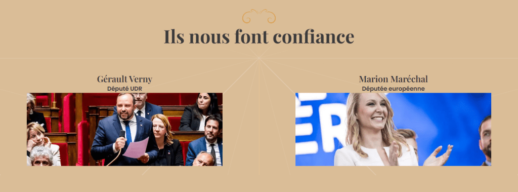Les visuels et slogans anti-wokisme qui dominaient le site en 2024 ont été remplacés par un discours plus institutionnel, mais la cible demeure inchangée. Deux figures sont désormais présentées comme clients : Gérault Verny, député UDR, et Marion Maréchal, députée européenne.